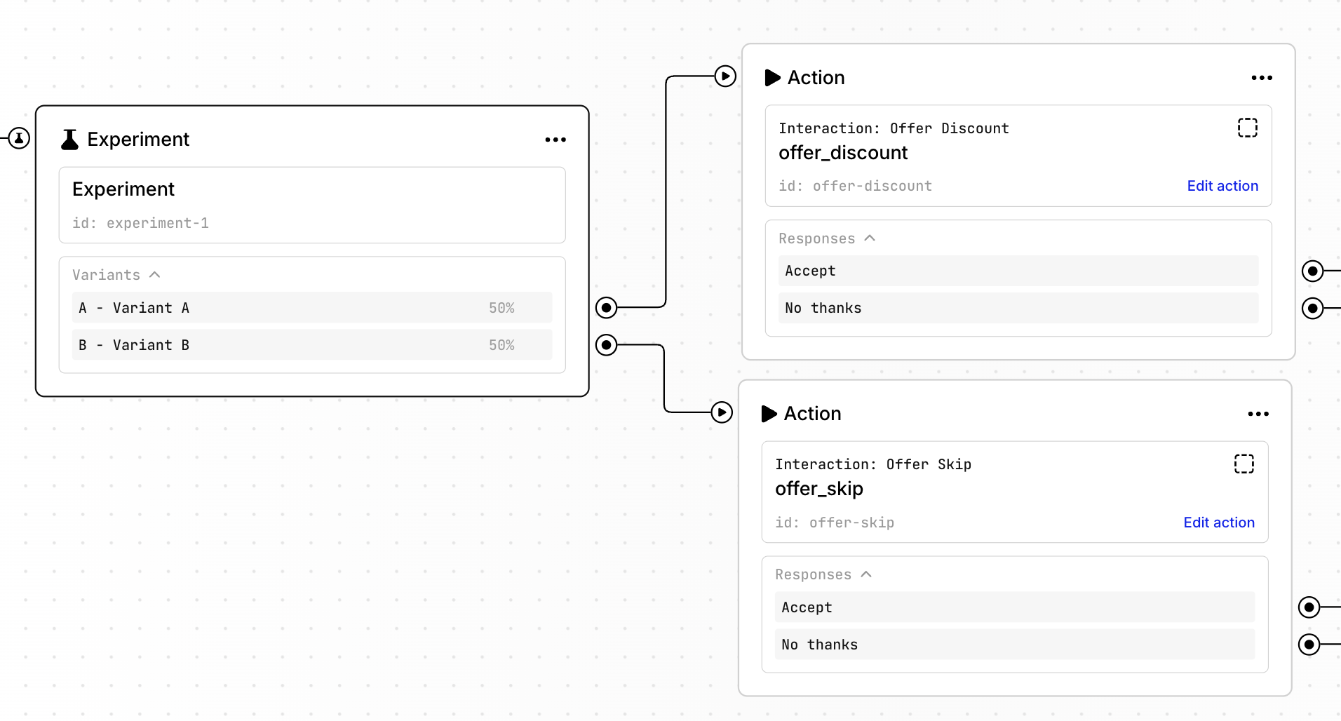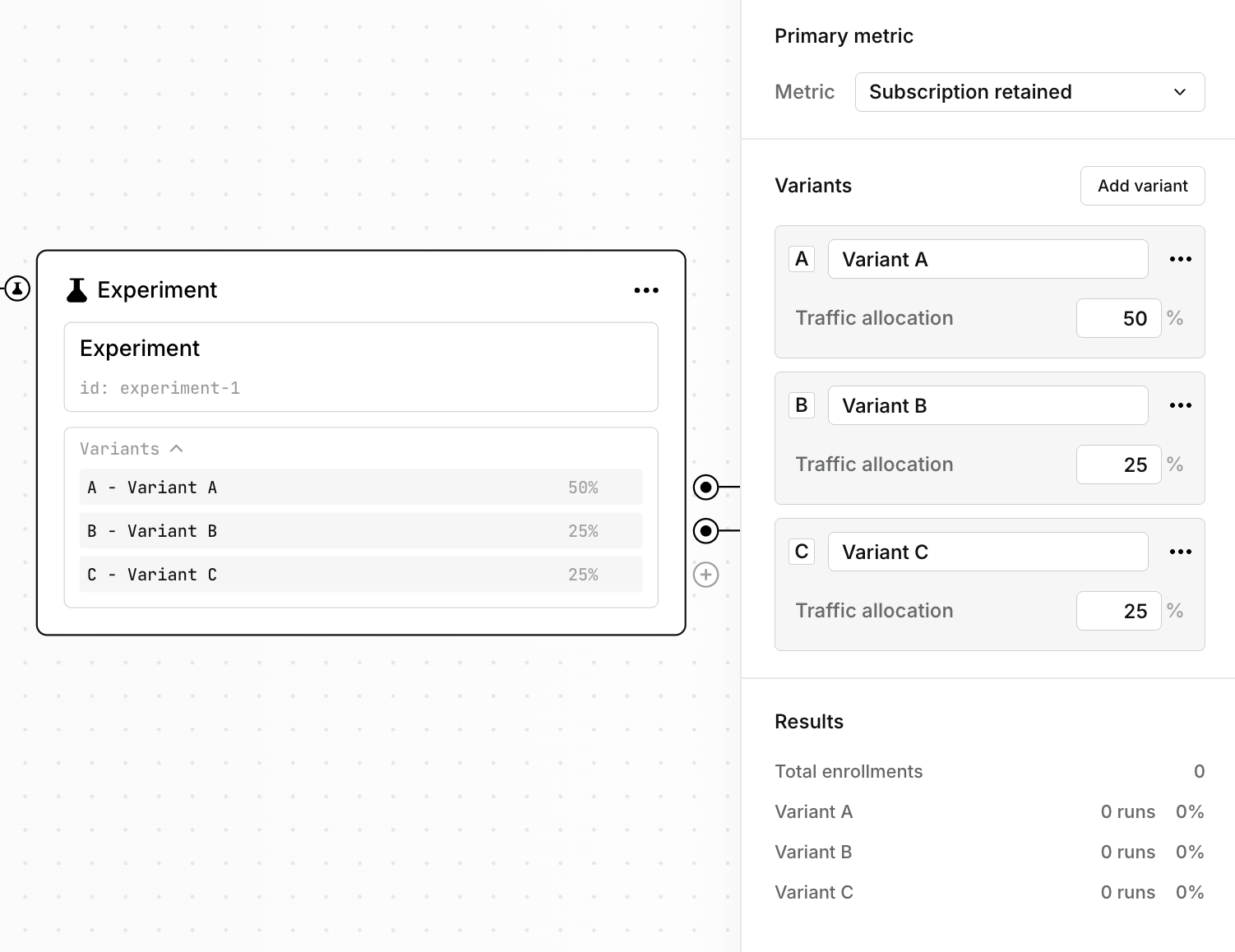 An experiment is a split step: it routes each customer into exactly one branch (Variant A, Variant B, …) based on your chosen traffic split.