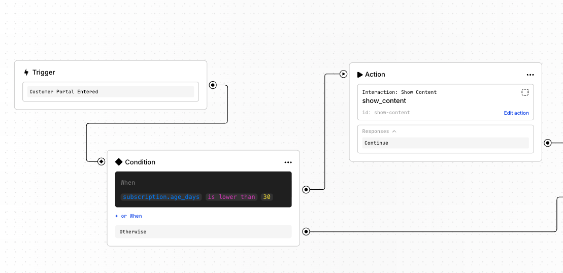 Workflows come with a visual builder where you create desired logic by connecting nodes using the following logic structure: Trigger → (optional) Conditions → Actions- ⚡ Triggers are events that start a workflow.
